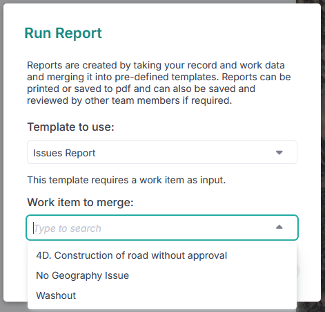 If the template you select has a work-item specific category, like 'Issues', you will also be prompted to choose which work item to associate with the report: