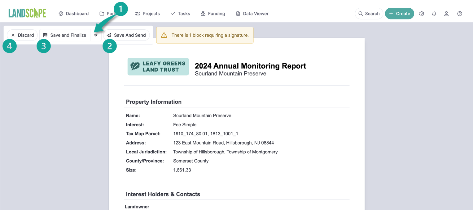 (1) To save the report as a draft and return to it later, click on the arrow next to 'Save and Finalize' and select 'Save as Draft'. This will save the report to the 'Reports' tab of a record. This is a good option if you would like to navigate away from the preview and still need to review the report later. Once a report is saved as a draft, you can find it via the Reports tab in the record and you can save it as a .pdf, send it to another user, delete it, or regenerate it.