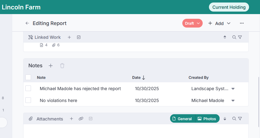 The Reviewer clicks on an assigned report to review it. They can add notes and edit Form responses, photo captions, and map views directly within the draft report.