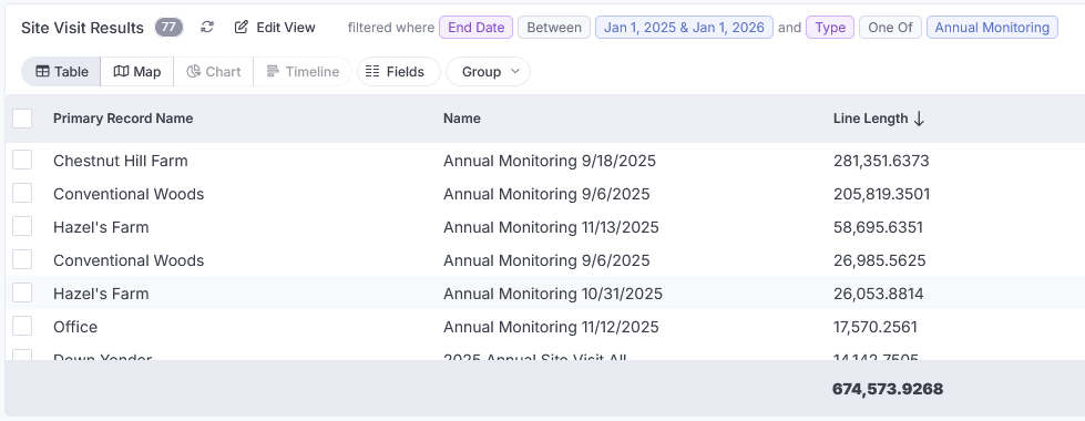 What if you want to see how far you walked on all of your site visits last year? Use the 'Total area' and 'Line length' fields in Data Viewer to view and summarize this kind of information across multiple records: