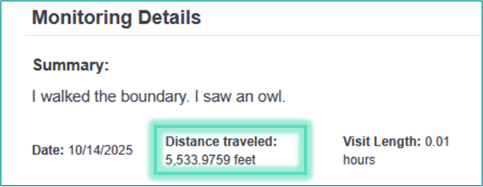 The area, length, or lat/long of any mapped object in Landscape is shown in the panel that opens when that object is selected. For example, to see how far you walked on a single monitoring visit, simply navigate to the visit and select your trackline on the map: