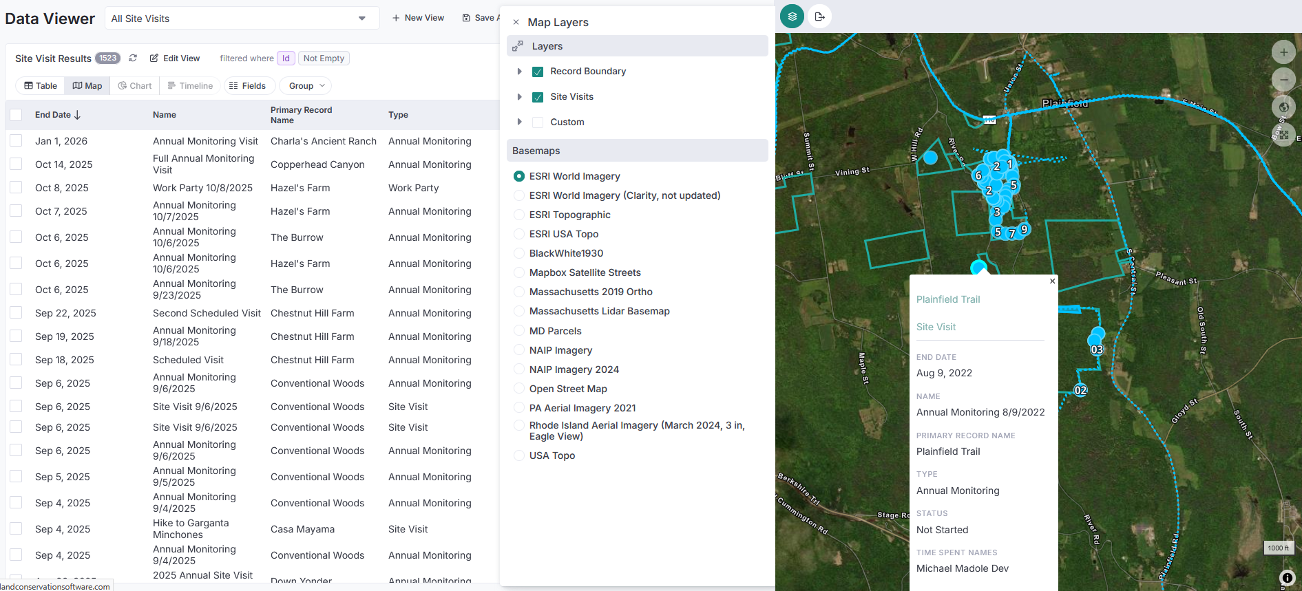 Finally, zoom into the area that they monitored and try selecting different points. If you find a point that corresponds with the visit, click on the 'site visit' hyperlink to be taken to that site visit.