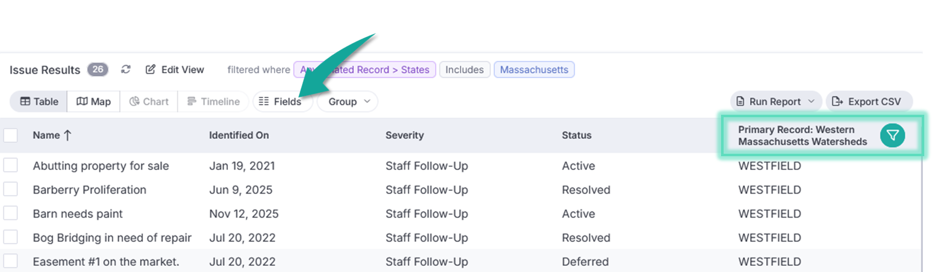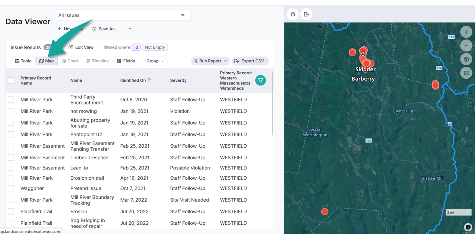 In Data Viewer, go to view of Issues. Open the Field picker and select the name of the Custom Map Layer you created in Step 1, then filter that field for a specific watershed: